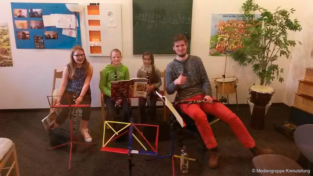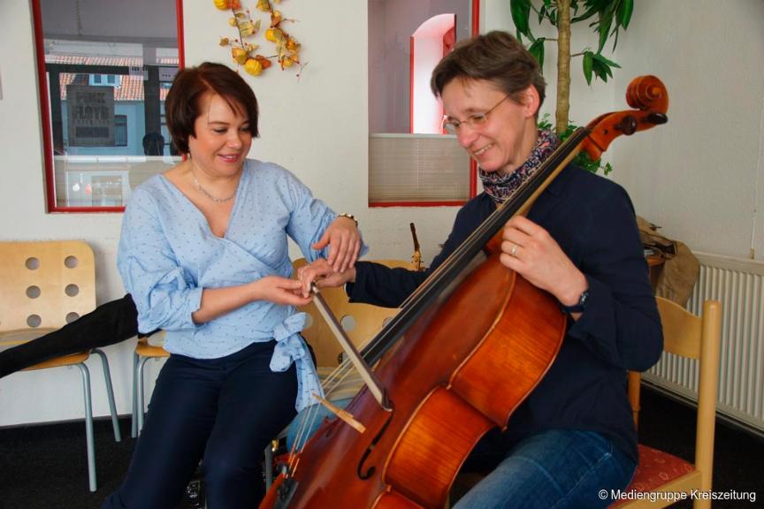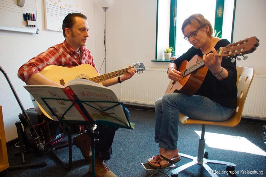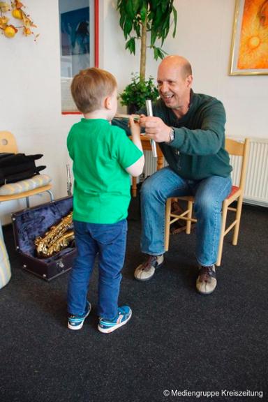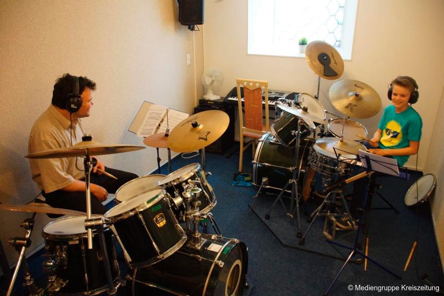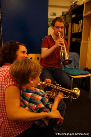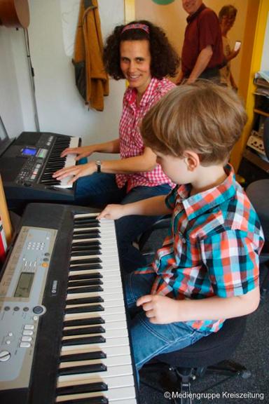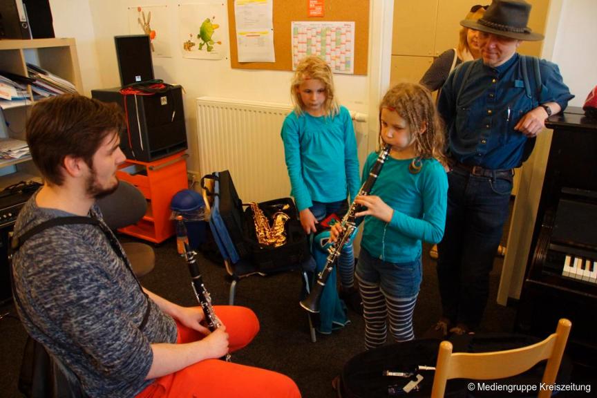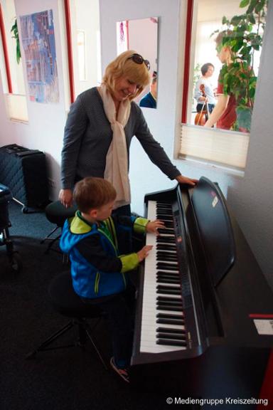Besucher bekommen nicht nur einen Einblick in den Unterrichtsablauf und können den Schülern bei Vorspielen zuhören, sondern auch selbst ein Instrument ihres Interesses ausprobieren.